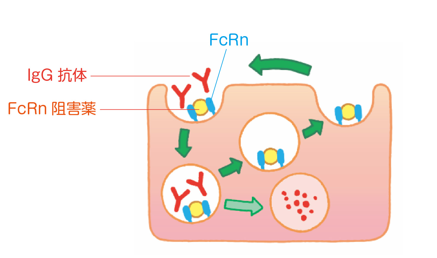 重症筋無力症患者さんでは、自己抗体を含むIgG抗体がFcRnによってリサイクル(再利用)され、その血中濃度が保たれています。FcRn阻害薬は、IgG抗体がFcRnに結合するのを防ぎ、自己抗体を含むIgG抗体の血中濃度を下げる薬です。IgGは体内に入ってきた病原体などから体を守るために働く抗体ですが、FcRn阻害薬を投与するとIgG抗体の血中濃度も下がるため、感染症に注意する必要があります。